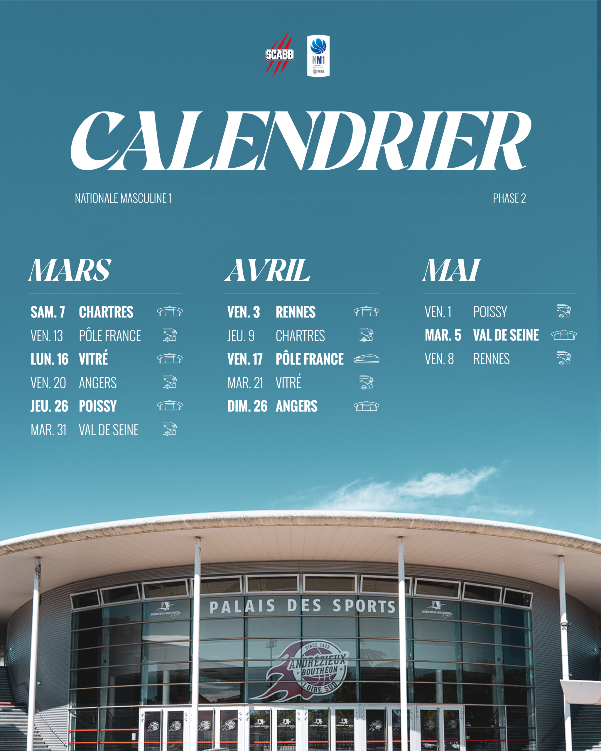 À l’occasion de la réception du Pôle France le vendredi 17 avril, notre équipe jouera exceptionnellement sur le parquet de l’Arena Saint-Étienne Métropole, en lever de rideau du match de notre équipe en Élite 2, qui elle recevra Denain à 20h30. Plus d’informations vous seront communiquées prochainement à propos de cet événement inédit !